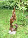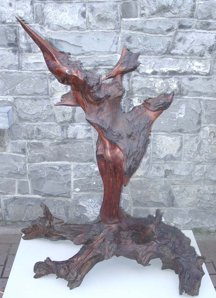 I rarely carve the myths and legends of Ireland, but one historical character who is ever present in my sculpture is Sweeney, a 7th century figure from Lisburn, Co. Antrim. He took great exception to the edicts of the ecclesiastical government of his day and with typical Celtic beligerence Sweeney declared his own war against the church. He went on the run, living wild, to continue his opposition. An original eco-warrior, his enemies considered him a mad-man living like a bird in the trees.